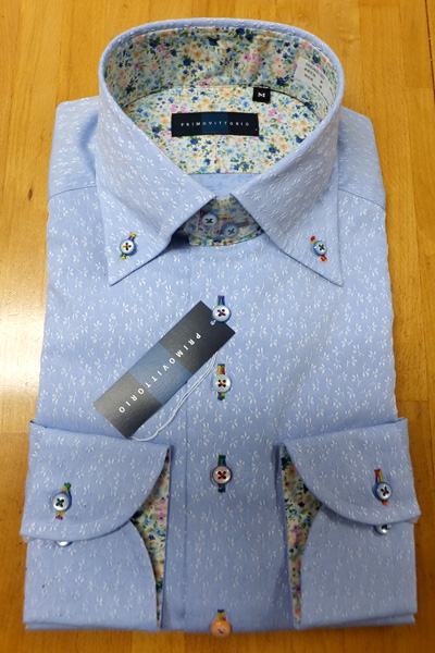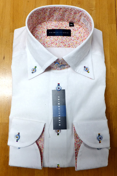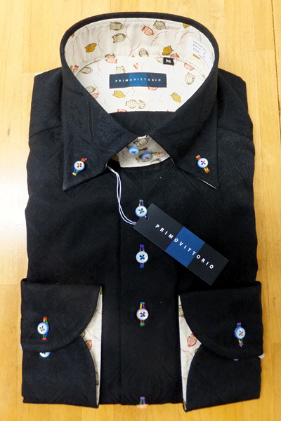 通常のシャツより袖が少し長めの作りです。 衿裏の柄は袖裏にも入っています。 袖つめ修理ご希望の方は、3cmまでは¥900。それ以上つめる場合は¥1,800 にて承ります。